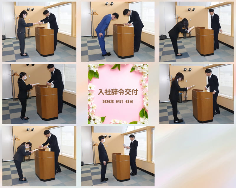 入社記念品や新しい名刺を受け取り、新社会人としての決意を新たにしている様子でした。